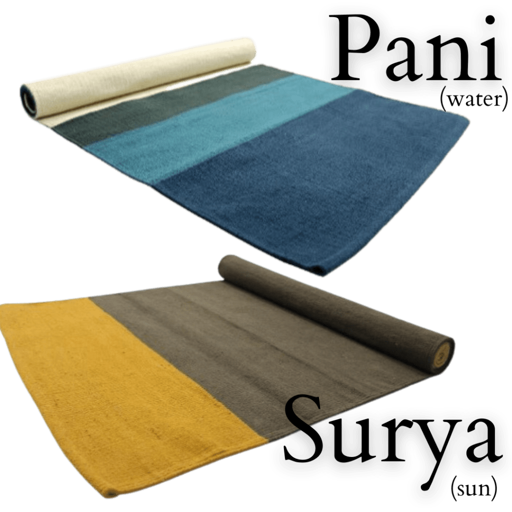 100% Cotton handwoven yoga mat. These mats are great for indoor or outdoor use, are washable, durable, have no yucky chemical smell, and are great to practice on. Unlike “sticky” rubber or synthetic mats, these mats require you to use your entire body in your practice, rather than relying on your mat to hold you in place. A different feel for most, but preferable after adjusting to it. These traditional mats are eco-friendly, comfortable, and last for years to come.